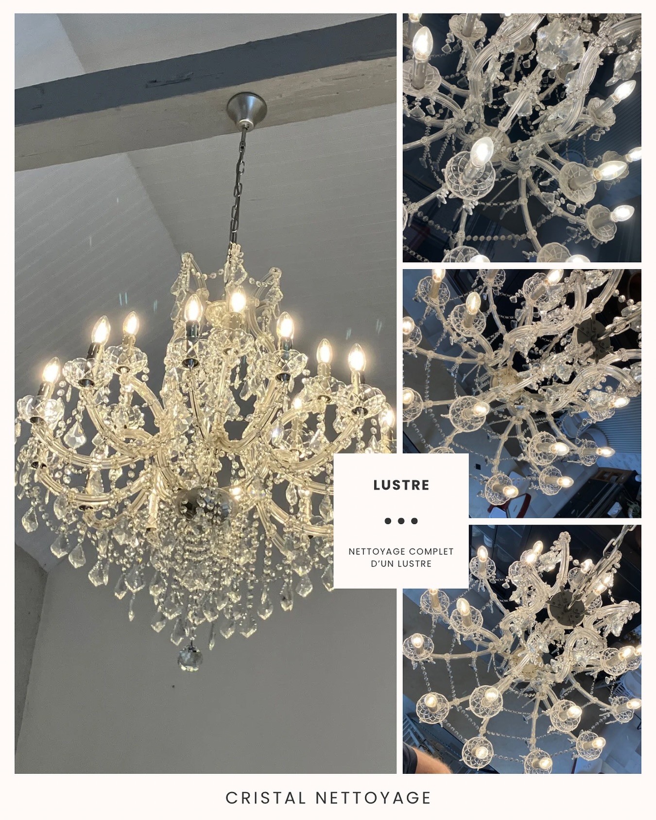 Après notre intervention, il retrouve tout son éclat, avec des pampilles parfaitement propres et une lumière qui illumine à nouveau la pièce avec élégance.